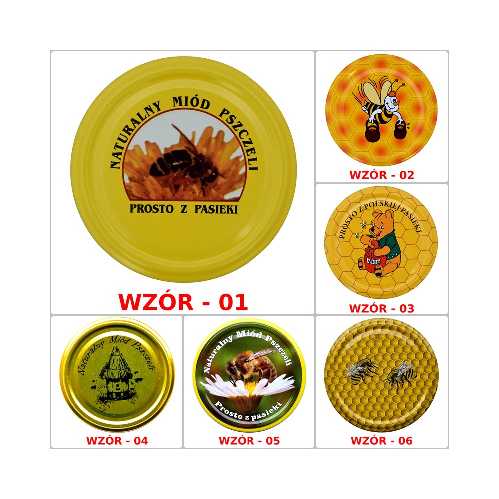 Dostępna w 5 różnych wzorach z motywem pszczelarskim w opakowaniach po 100 szt. lub karton 700 szt. (7 opakowań)