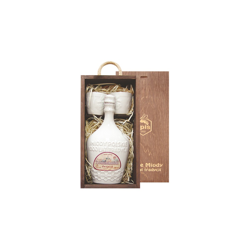 Dwójniak "Dominikański" w kamionce 0,5 l w skrzynce drewnianej bejcowanej, wypełnionej wełną drzewną, z dwoma czarkami w kolorze kamionki.